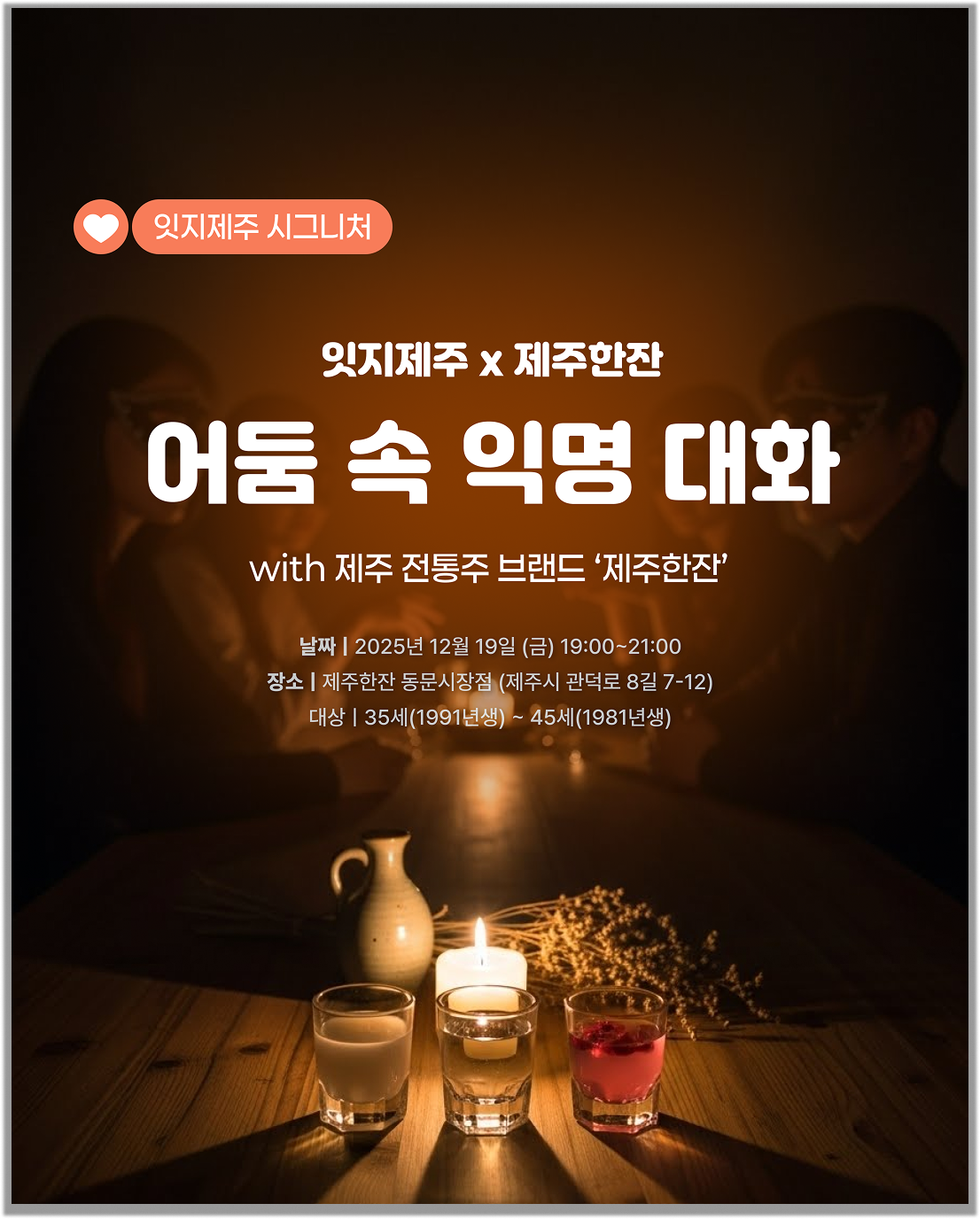 12/19(금) 제주한잔과 함께하는 어둠 속 익명 대화 🍶드디어 그간 요청이 많았던 3040을 위한 시간을 준비했어요! 12/19(금)에 만나요✨